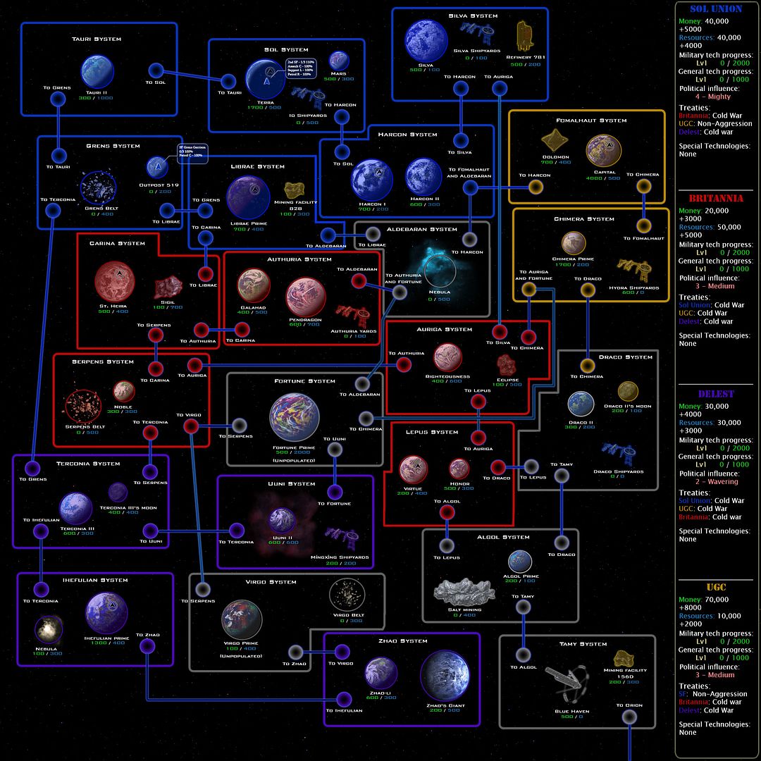 Furthermore, the Delest are completely isolated from the front lines; assuming the Cyrvans / Hierarchy come from Orion (and no sneaky starlances open up elsewhere), the Delest fleets will have to negotiate passage through at least 5 systems to reach Tamy and they will have to cross other nations' sovereign territory. Given the diplomatic penalty the Delest start with, that might be a problem.